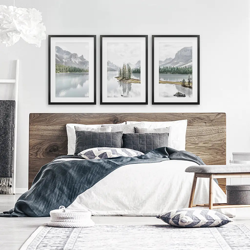 This minimalist wall art set depicts a mountain lake in Jasper National Park, which is the largest park in the Canadian Rocky Mountains. It makes you admire the beautiful Nordic nature. This decor will make a great addition to your interior.