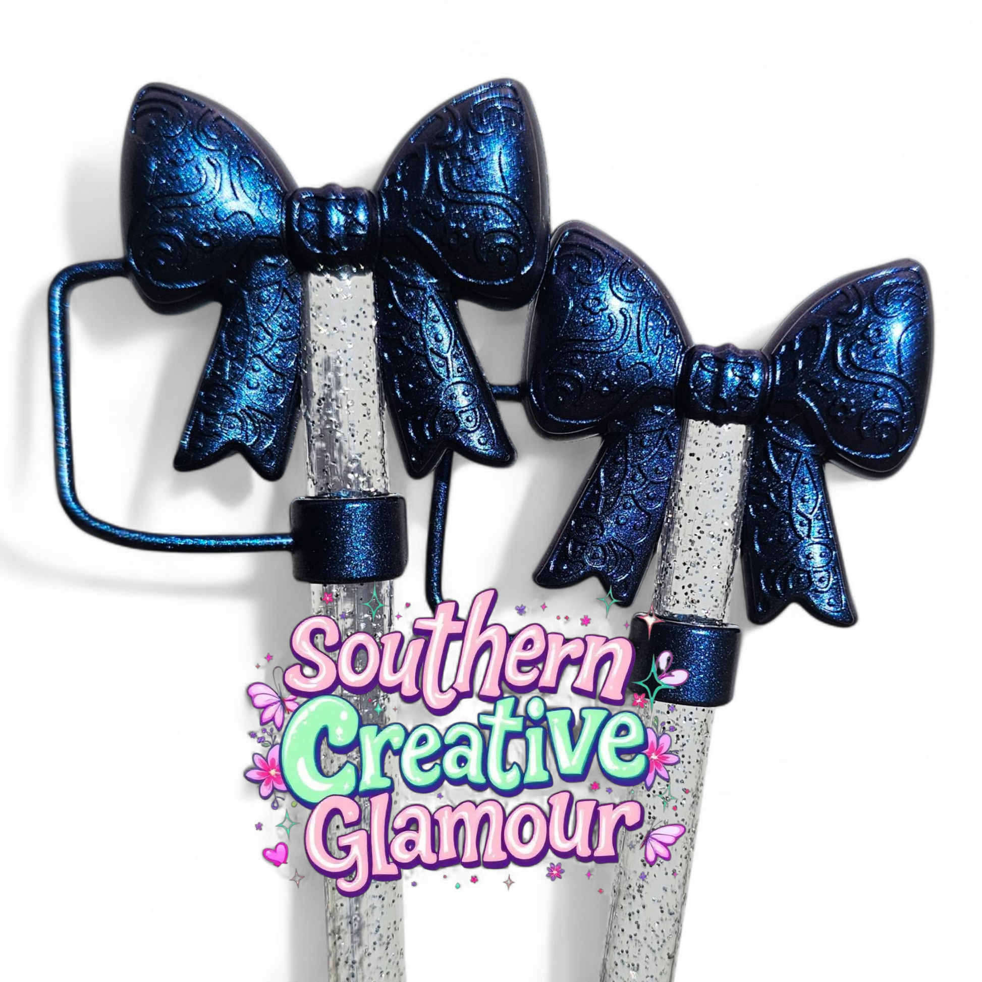 Chameleon Blue | Chroma Blue Shimmer | Metallic Blue Shimmer 3D Silicone Paisley Bow Straw Topper