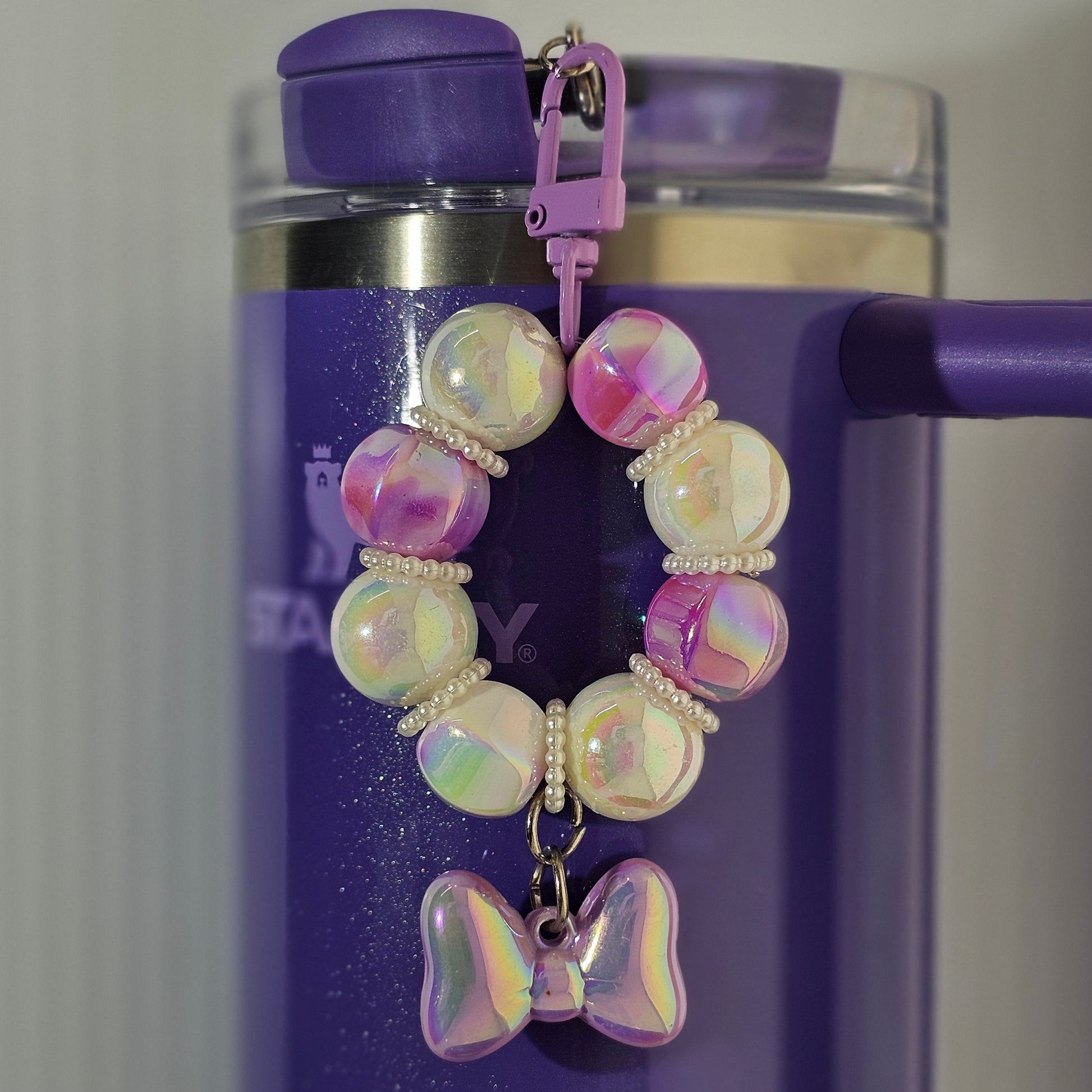A beaded bracelet with a bow charm pendant that can be used as a charm for your tumbler, tumbler straw, purse, bag, keychain, backpack, or cellphone.